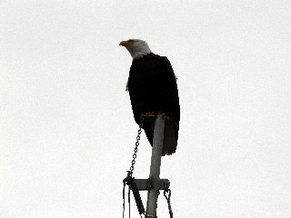 Monday, June 5, 2006 - We departed Taku Harbor at 10:00am and headed north to Juneau. During our voyage up we were treated to more whales again surfacing close to the boat. I think that they were as surprised to see us as we were them. We also had cruise ships bearing down on us on their way to deposit thousands of tourists to downtown Juneau. We are actually staying at Auke Bay, 12 miles north of Juneau and it is a beautiful setting with jagged snow covered peaks. We arrived in the rain, docking at 1:45pm. We had become some what jaded by the number of eagles that we encounter daily, but the one here in Auke bay is huge. He has chosen to rest atop one of the arms of the fishing vessel moored in front of us.
