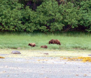 Tuesday, June 27, 2006 - The extended forecast for north of Sitka is rain, rain and cooler temperatures. We decided that we are tired of wearing our winter clothes and are going to begin to head back south. We departed Sitka at 8:30 after fueling up and headed back up the Olga and Neva Straits through Serguis Narrows and into Peril Strait. Our destination for the evening was Appleton Cove at the entrance of Rodman Bay. We followed in two other boats in to the cove and found two other boats already anchored as well as about 40 commercial crab pots in the preferred anchor area so we opted for the other side of the cove in front of the forest service cabin. We dropped the dingy and one of our crab pots in hopes of catching dinner. We are definitely seeing more pleasure boats in the waters than we had in the previous weeks. We did have fresh crab for dinner and our choice of anchorage provided us with some great bear viewing that evening. We watched a mother and two cubs foraging in the grassy meadow for over an hour. On the opposite shore we spotted three other brown bears doing the same.
