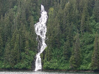 Thursday, June 29, 2006 - We departed Warm Springs Bay at 9:45am for a short run south (15 miles) to Red Bluff Bay which was described to a spectacular anchorage. Along the way we spotted about 8 different whales feeding along the shoreline as well as many waterfalls. As we entered into Red Bluff Bay, we spotted a group of sea lions basking in the SUN on the rocks exposed by low tide. The bay was as described, with red rock cliffs at the entrance, a huge waterfall on the south wall and the high peaks with additional waterfalls cascading down the face. Gypsy had also chose this as their evening destination and we joined Dave and Heather on their boat that evening. We dropped the dingy and placed both our crab traps in between the commercial traps and hoped we would catch dinner again. A 70' Nordhaven had anchored in front of the waterfall in a depth of about 150' but later moved between ourselves and Gypsy when the winds picked up.