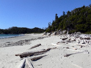 Saturday, May 13,2006 - Decided to sleep in (yeah!) as we were going to make a short run of approximately 40 miles to Pruth Bay. At our typical cruising speed of 8 knots it will be about a 5 hour trip. Plenty of time to take in the scenery and watch for floating logs and other debris. Pruth Bay has a wonderful anchorage if front of the Hakai Beach Resort, a luxury fly in fishing resort. Unfortunately the resort was not open as their season did not start until July 1st. That had it's pluses and minuses. On the positive side was the fact that we would not be have to deal with the constant coming and goings of seaplanes bringing in guests. The negative side was we were looking forward to dinner out in their restaurant and there was no telephone or internet available. There is a walking path from the lodge to West Beach which is a spectacular white sand beach on the west side of Calvert Island. It was truly amazing, with large ocean surf and pristine clear water.